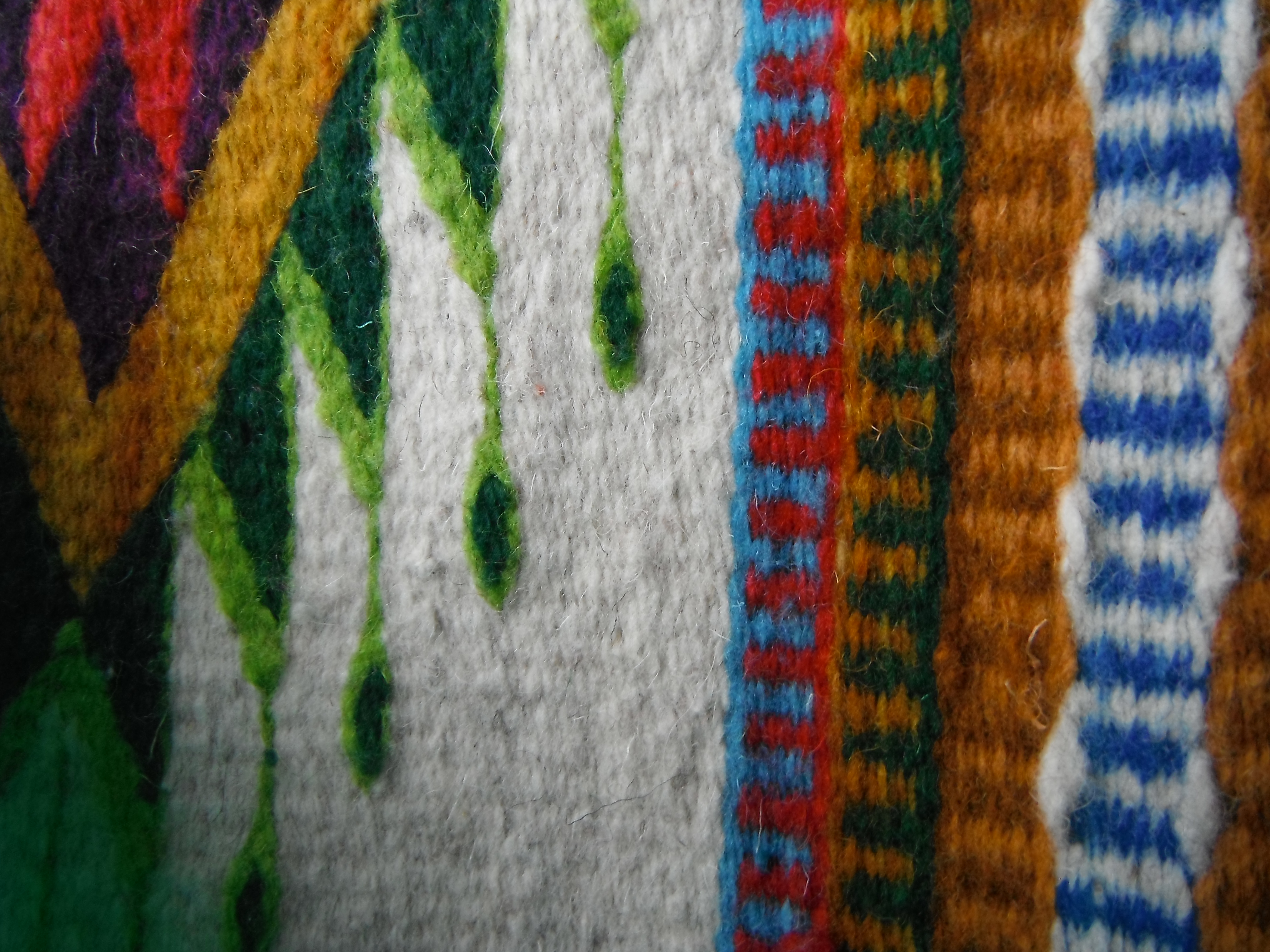 After the demonstration the weaver invited us to tour the showroom area where rugs, blankets, bags, and other woven art were on display for sale. This showroom was part of a co-operative of four local families, including the one whose house we were in, who made all of the pieces by hand. A white rug with bright green, purple, and blue decorations immediately caught my eye, but I hadn’t realized we’d have an opportunity to shop on the tour, so I hadn’t brought enough cash to make the purchase. Still, I eyed it longingly, inquired into the price, and sadly walked away.