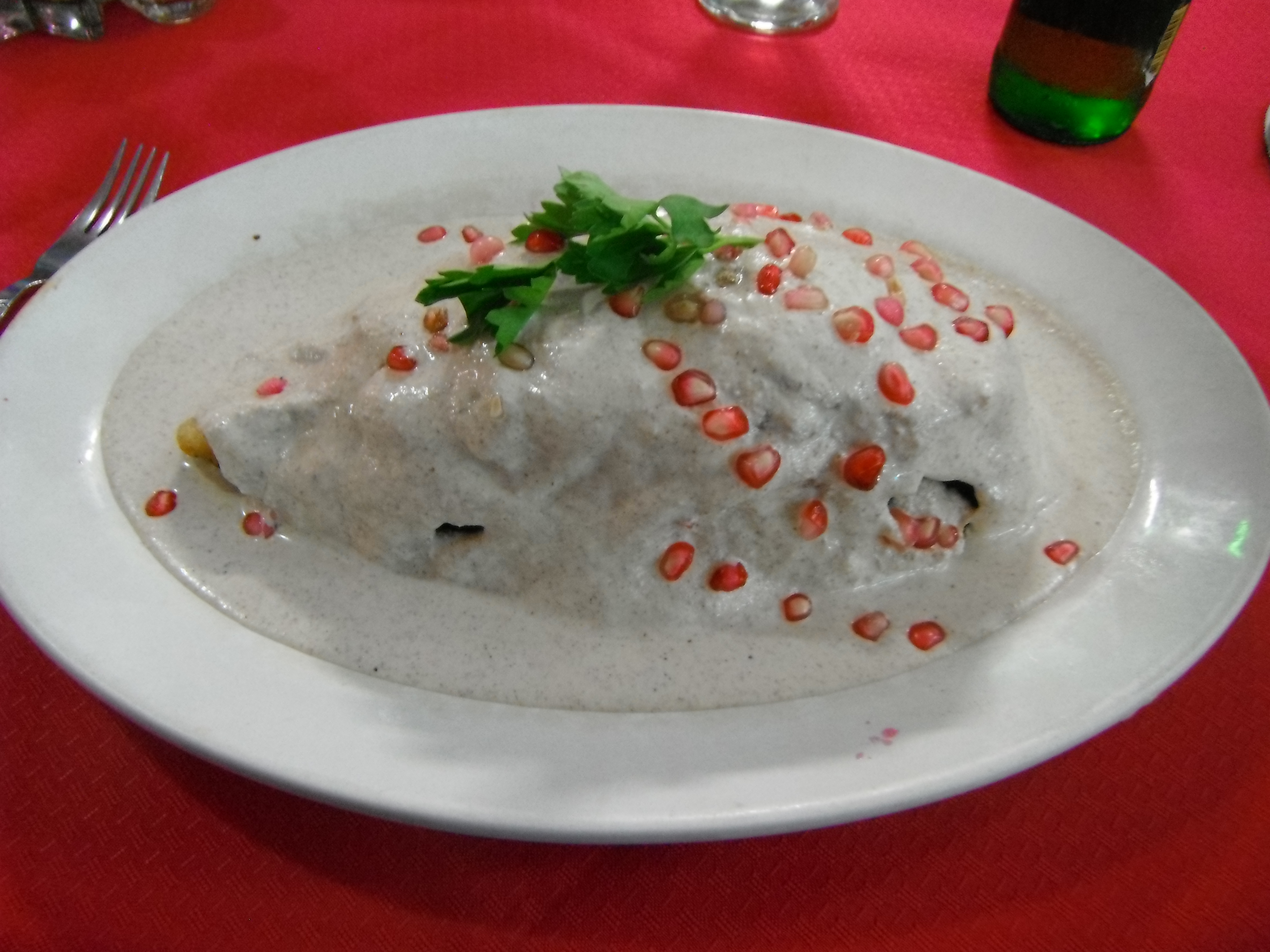 Hosteria Santo Domingo is said to be the oldest restaurant in Mexico City, and I ordered their specialty – Chile en Nogada. Soon I found myself sitting in front of a massive green chili stuffed with ground meat, raisins, and nuts, covered in a sweet white sauce (I believe walnuts are involved) and sprinkled with pomegranate seeds. YUM.