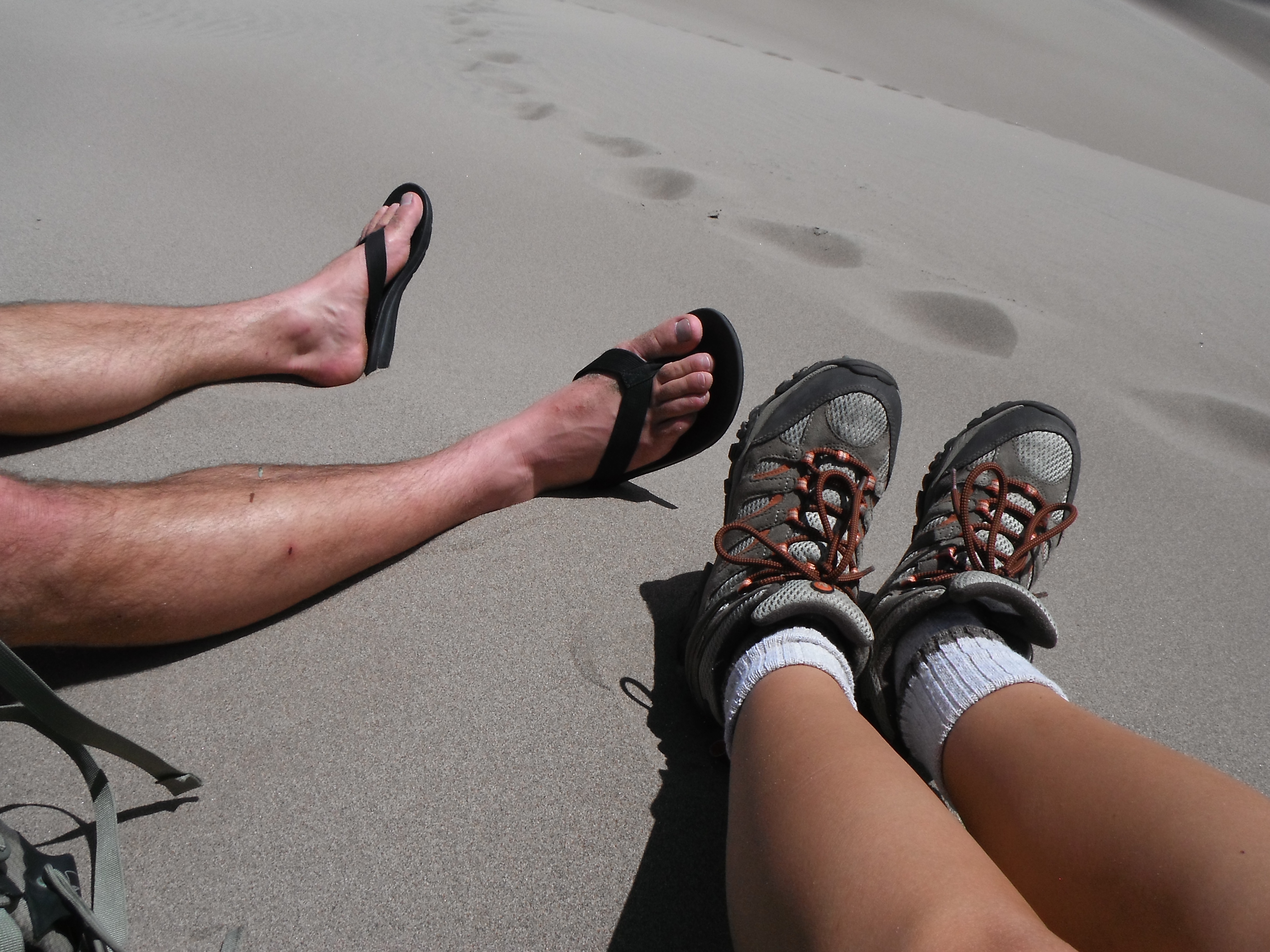 Finally we reached our high point for the day, and I collapsed in the sand to catch my breath. Austin sat down beside me and we spent a long time enjoying the breeze and the view. Just like our climb at Black Canyon, Austin had done the whole thing in flip flops. I could feel the sand piling up in my boots – soon there wouldn’t be much room left for my feet. For the millionth time I cursed my collapsed arches and bad ankles.