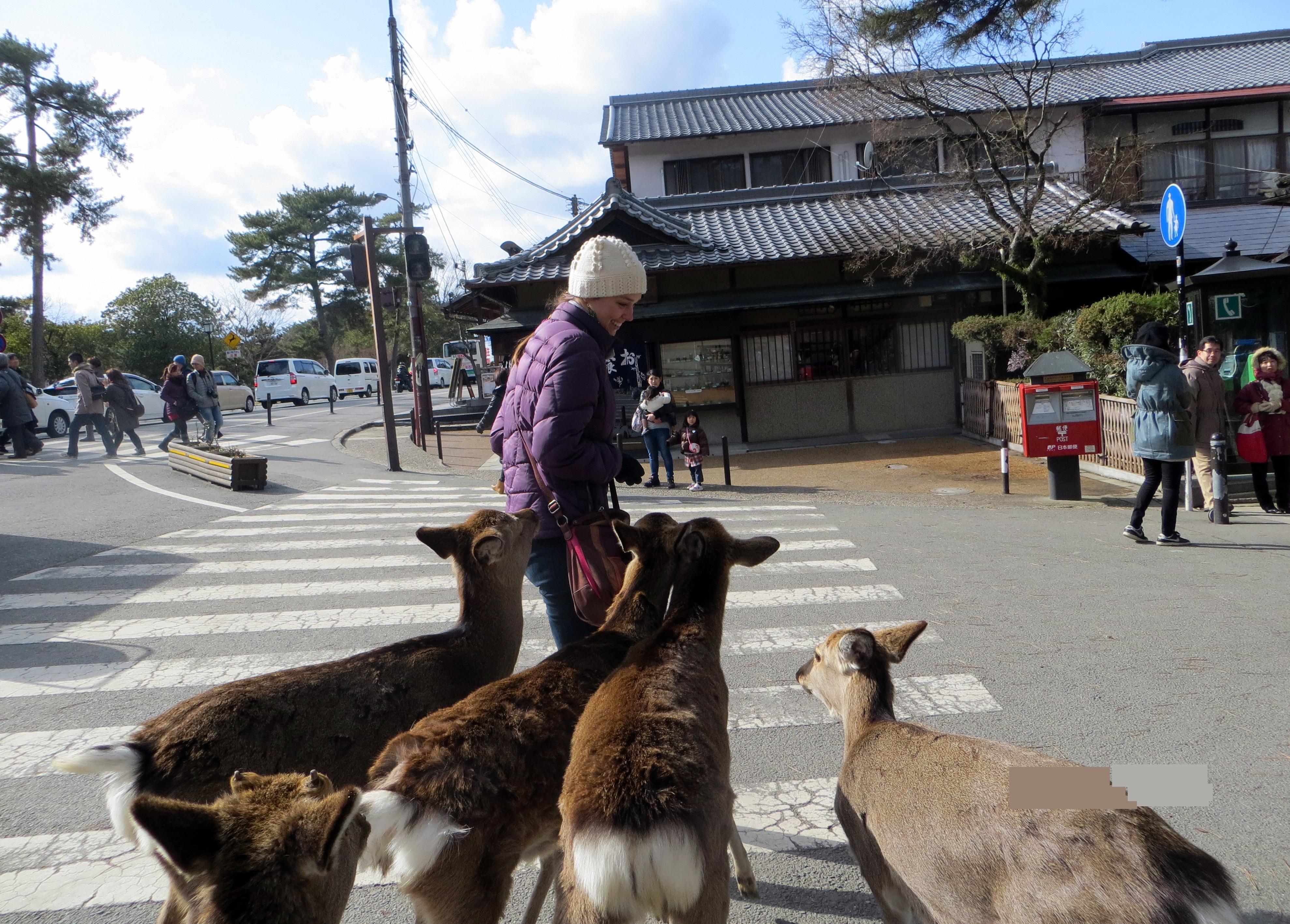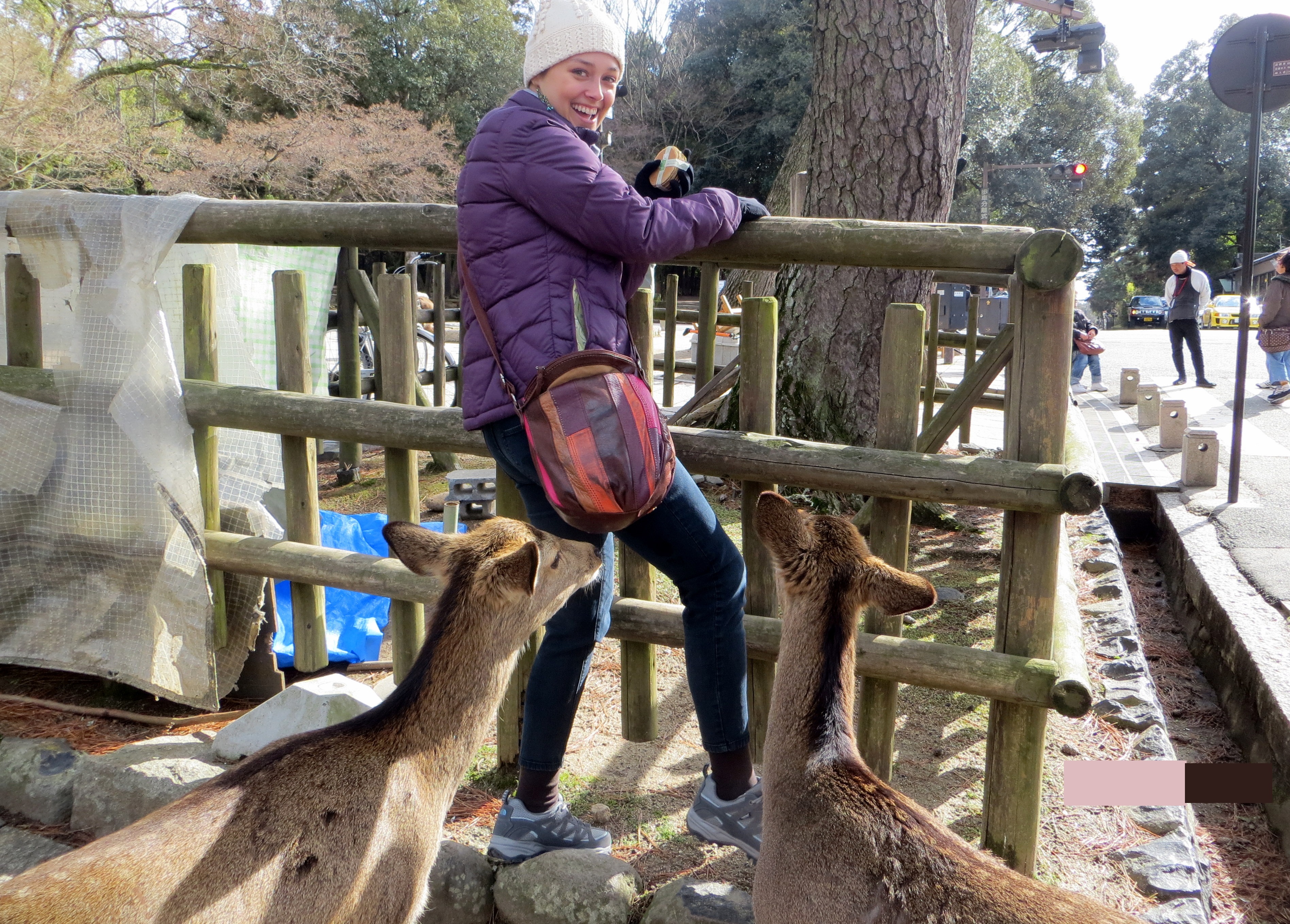 There were already a crowd of deer huddled around the cart, appearing mysteriously apathetic to the stacks of crackers sitting in front of the smiling vendor. But their demeanor changed immediately the second the crackers reached my hand. Once placid, the deer came together and aggressively surrounded me – nipping at my pants, my purse, and my jacket to get to the crackers in my hand. Bound by a piece of paper, I hurried to break it apart so as to distribute the crackers to this horde of bullies. But the deer were impatient and relentless, and before I knew it I was attempting to climb fences, running down the street trying to buy myself the time to unwrap the crackers.