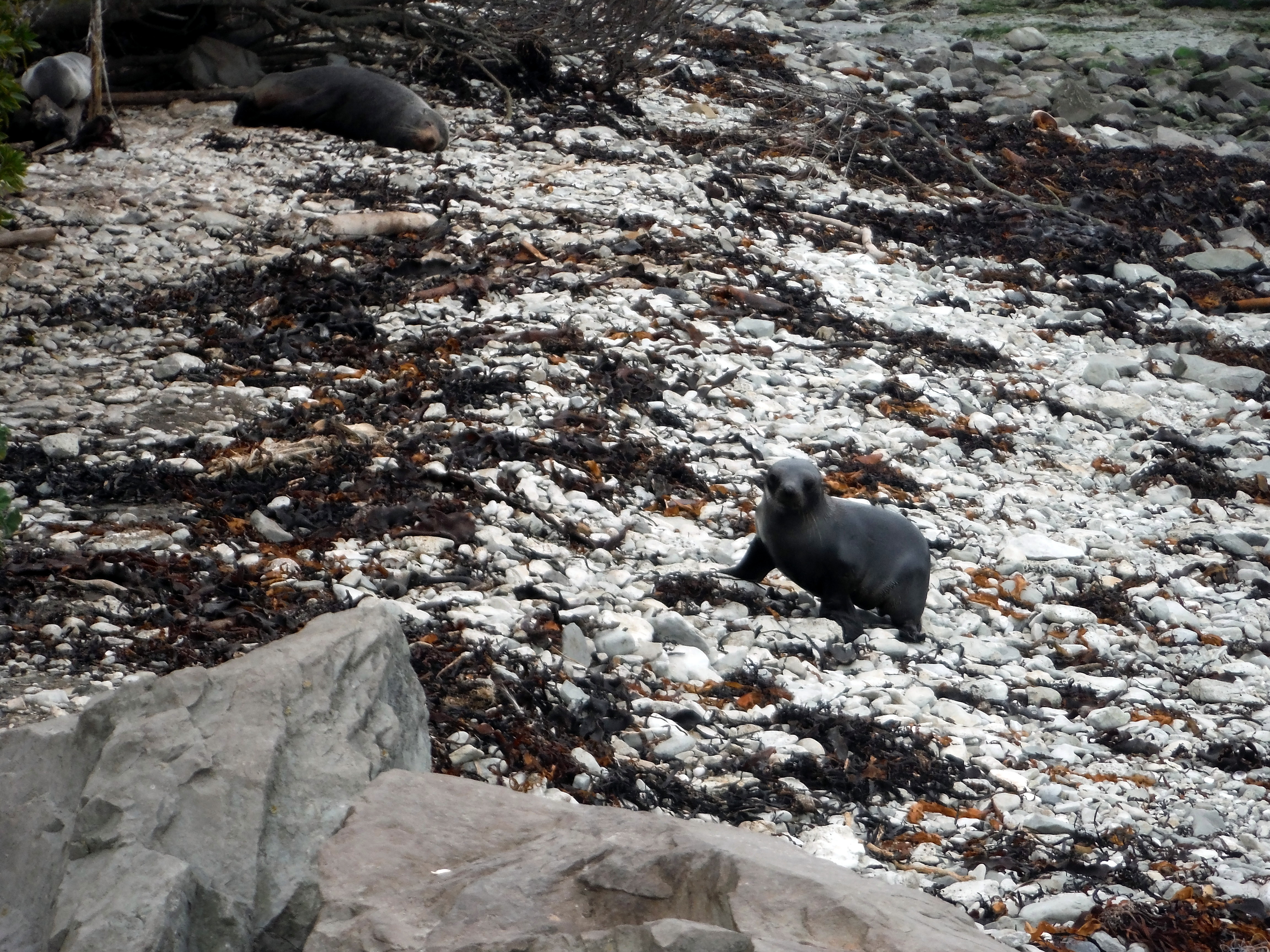 After checking in to our accommodation, we headed to the eastern edge of the town to check out Kaikoura’s most famous year-round inhabitants – a large colony of southern fur seals. They were lethargic on this chilly day, passed out on the rocks along the shoreline and in the case of these youngsters, right along the banks of the parking lot.