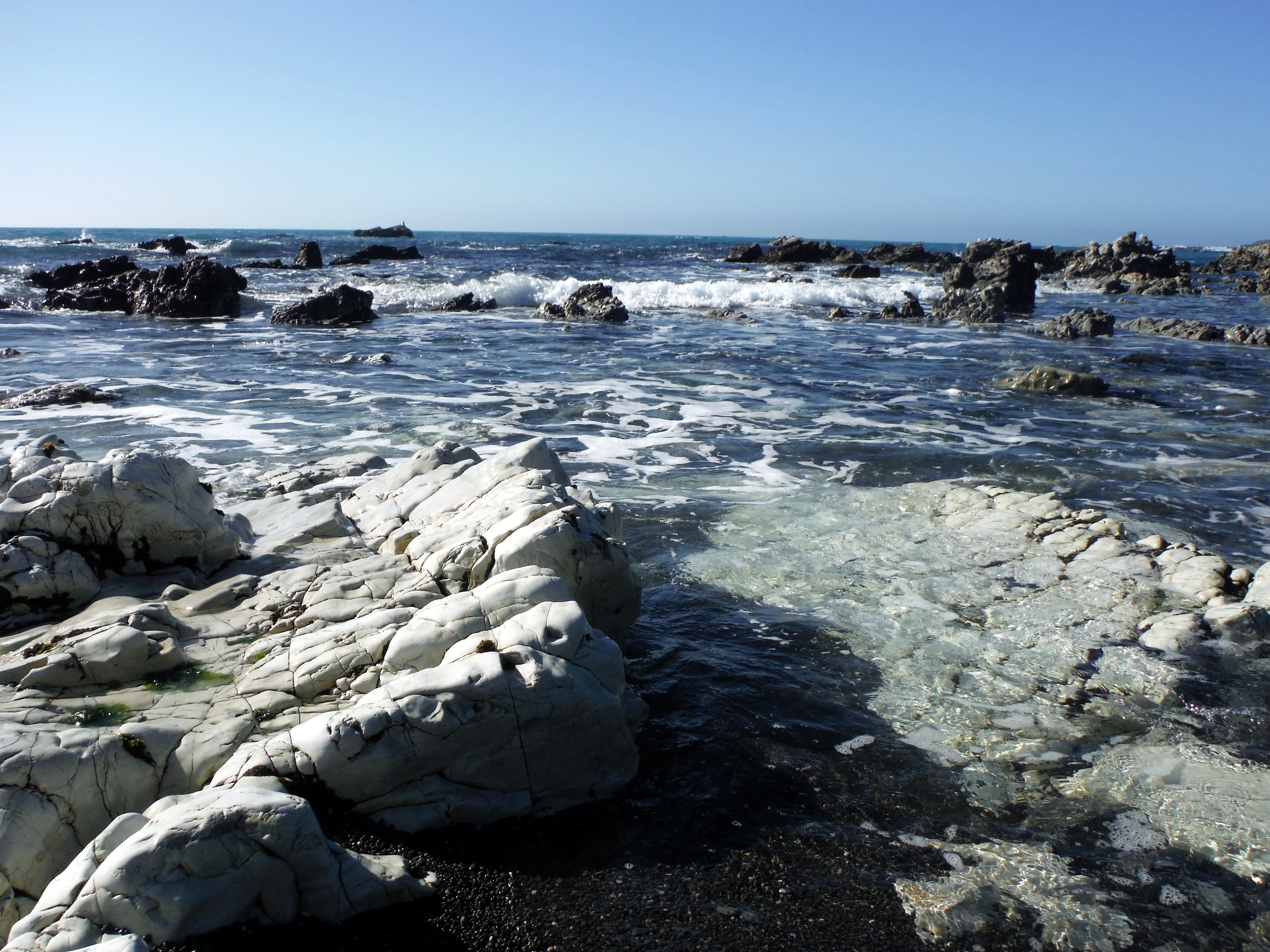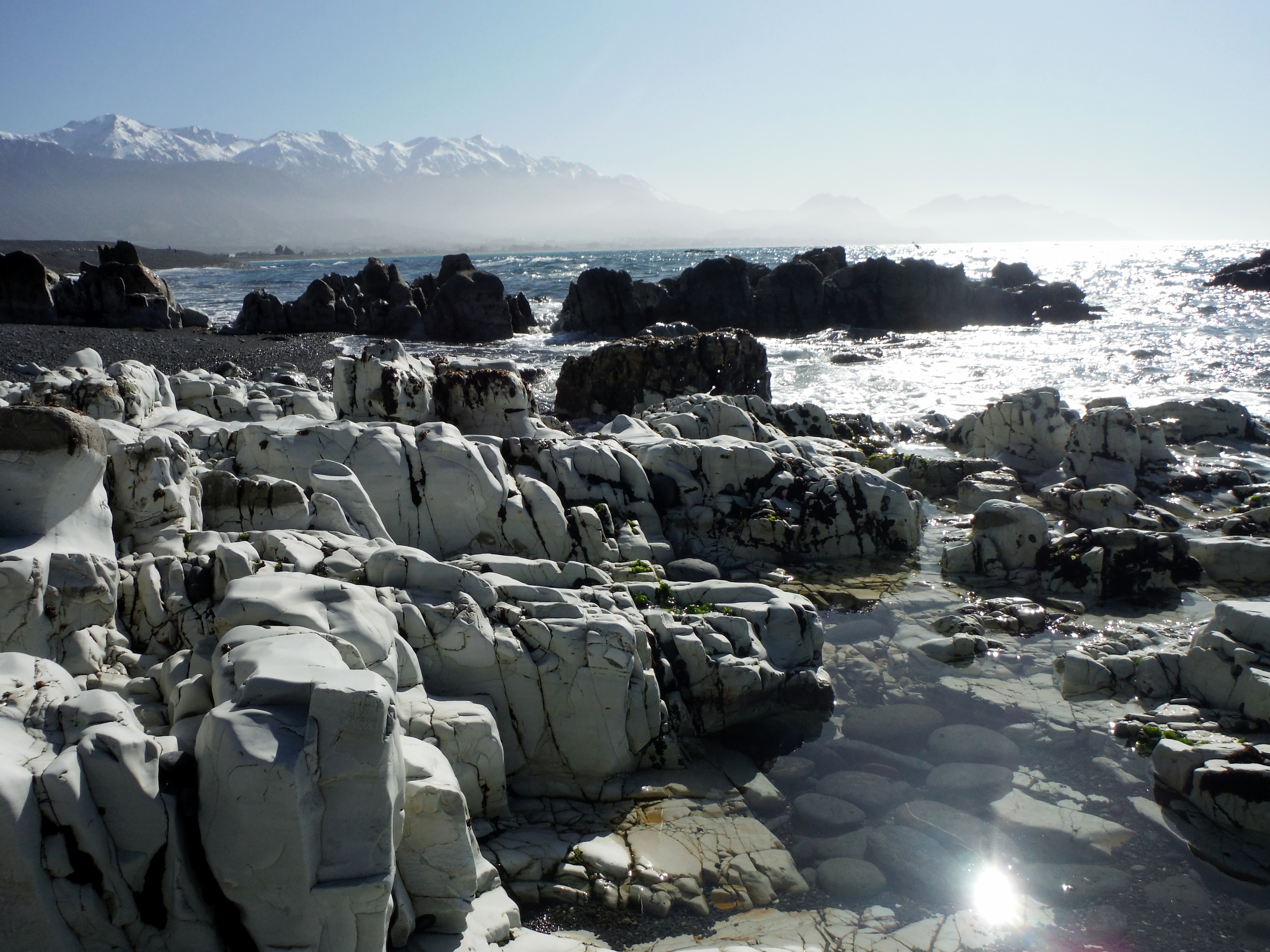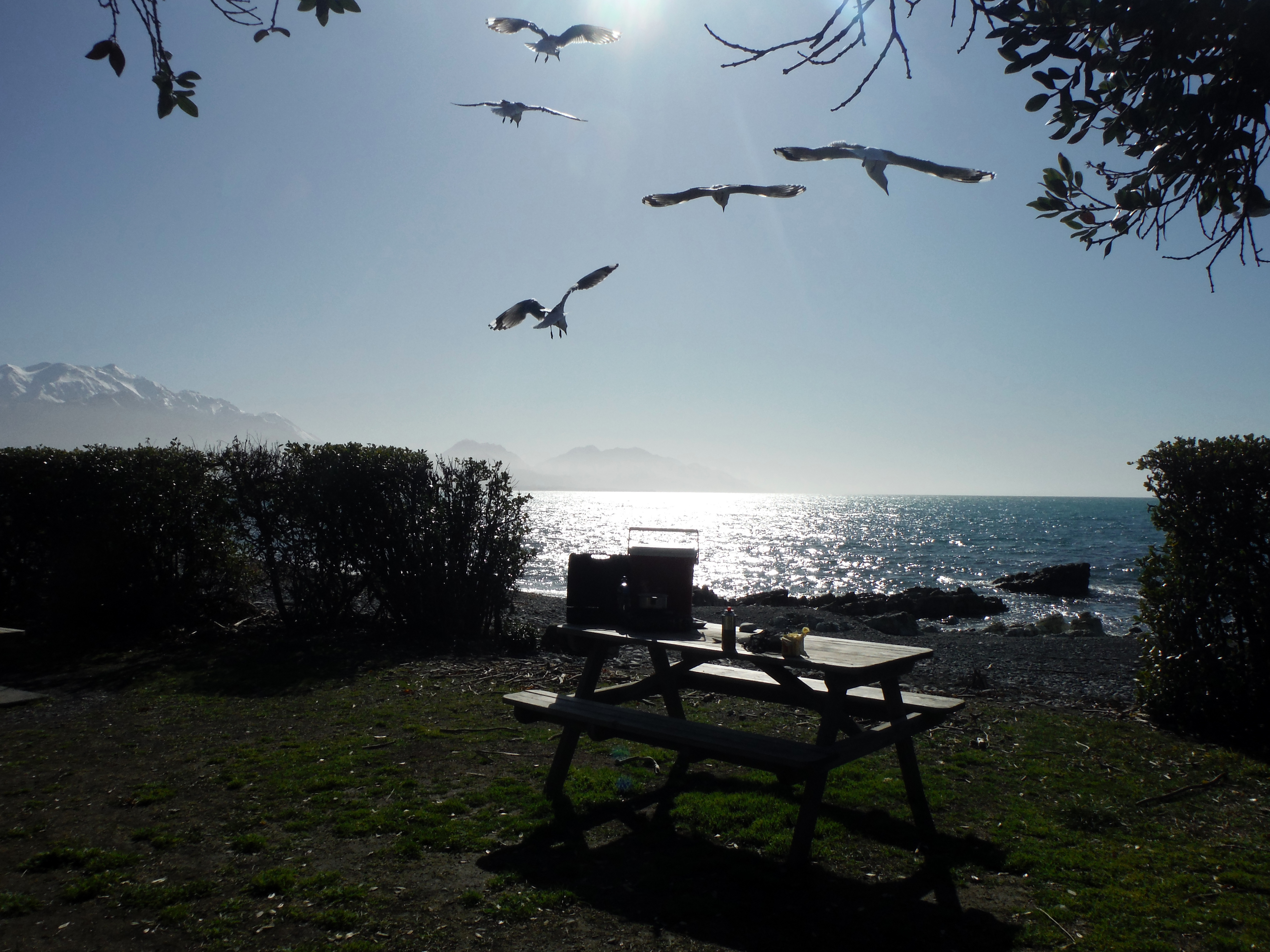 The next morning we awoke to find the clouds had moved on. It wasn’t the first time New Zealand treated us to a blue sky day, but it was gorgeous all the same. We made our way to the shore to pull out our trusty camp stove one more time. We breakfasted in view of crystal waters on a beach of pebbles and smooth, black and white stone. In the distance were the Kaikouras themselves, the mountains appearing mirage-like through the sparkling sea mists. Local seagulls, delighted by the smell of our meal, ambushed us in welcome – their advances so bold we eventually had to move our stove under the safety of a tree. Those damn birds didn’t get a scrap.